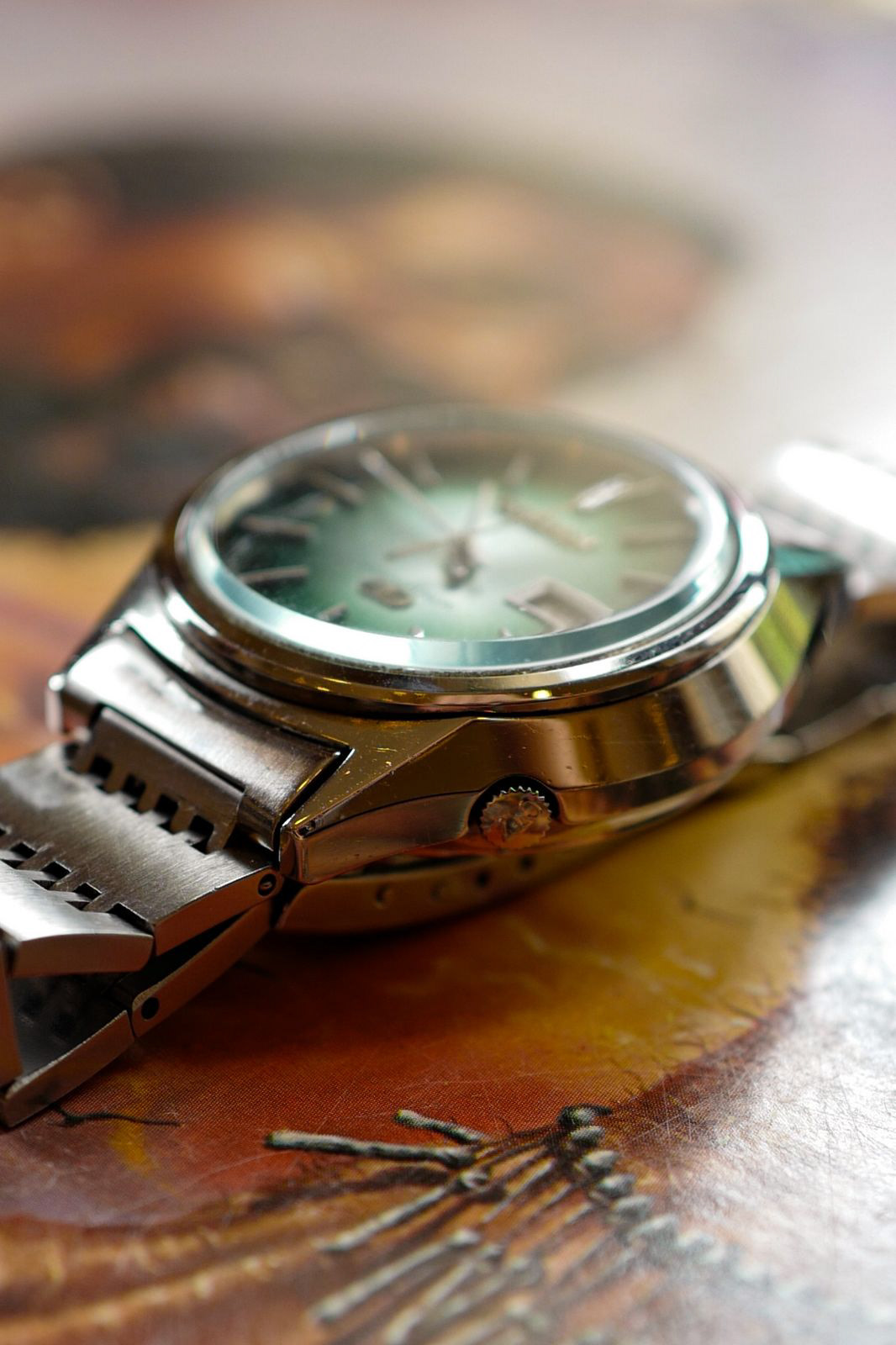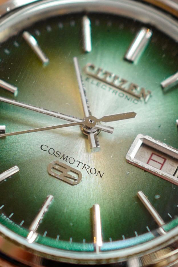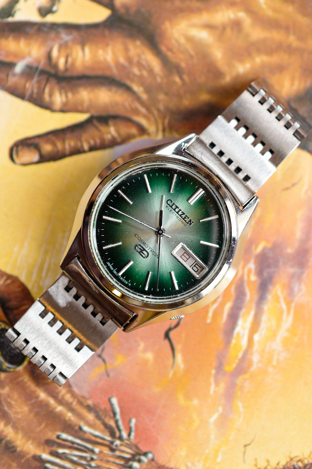 Born in an era defined by innovation and optimism, the Citizen Cosmotron Electronic of the 1970s stands as a landmark in watchmaking history. Introduced in the late 1960s and rising to prominence in the 1970s, the Cosmotron was one of the world’s first commercially successful electronic watches, powered by an electronically regulated balance rather than a traditional mechanical system. This breakthrough marked Citizen’s bold step into the future, bridging the gap between classic mechanics and the coming quartz revolution. With its distinctive futuristic case, and sunburst green dial alongside its original stainless steel bracelet, and smooth sweeping seconds, the Cosmotron perfectly reflects the space-age spirits of its time. Today, the Citizen Cosmotron is more than a vintage watch, it is a historical milestone. A reminder of a transformative chapter in horology, worn on the wrist by those who appreciate not just timekeeping, but the story behind it. A true icon of 1970s innovation.