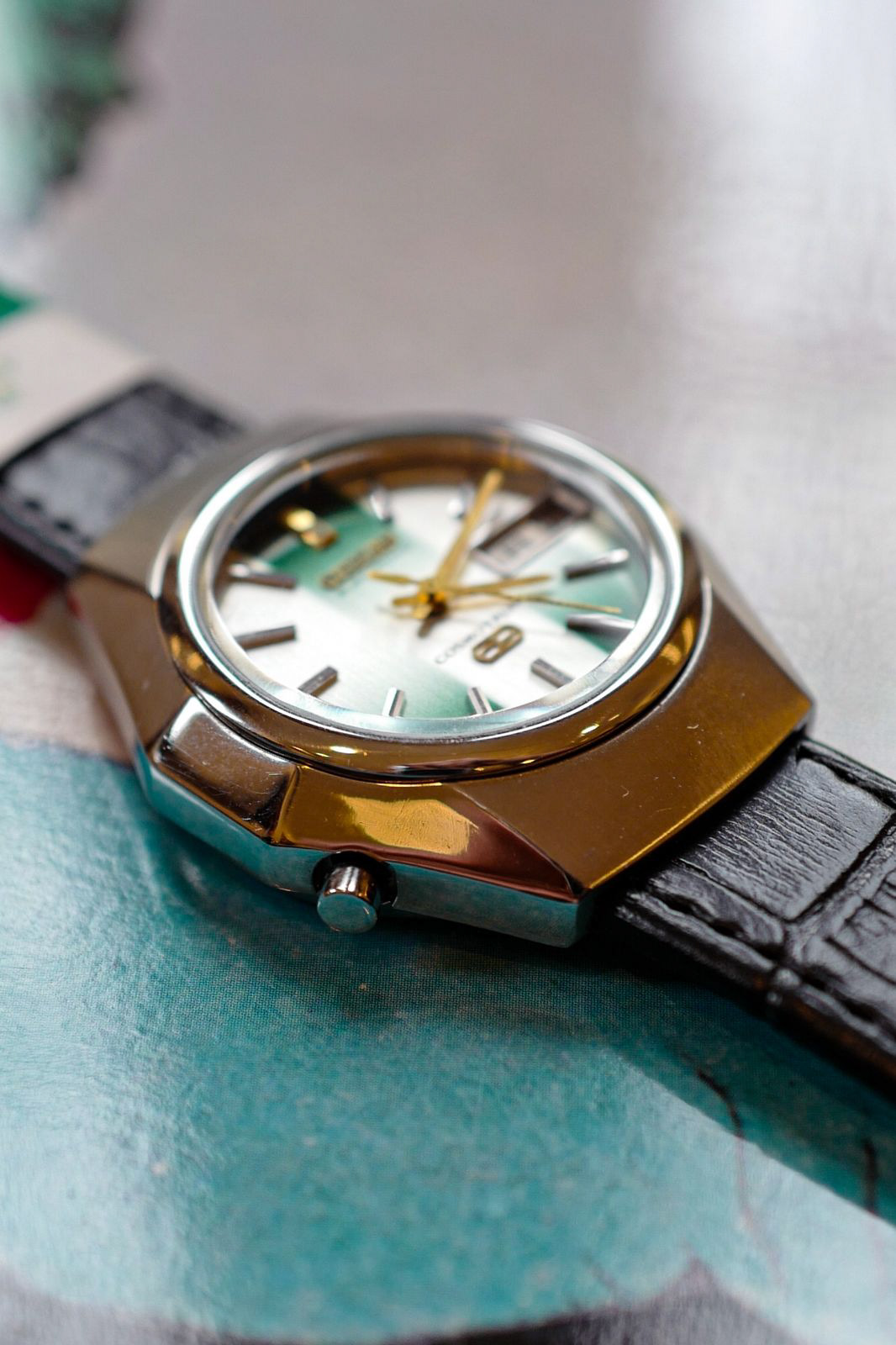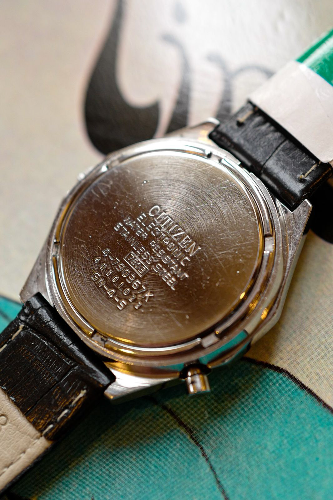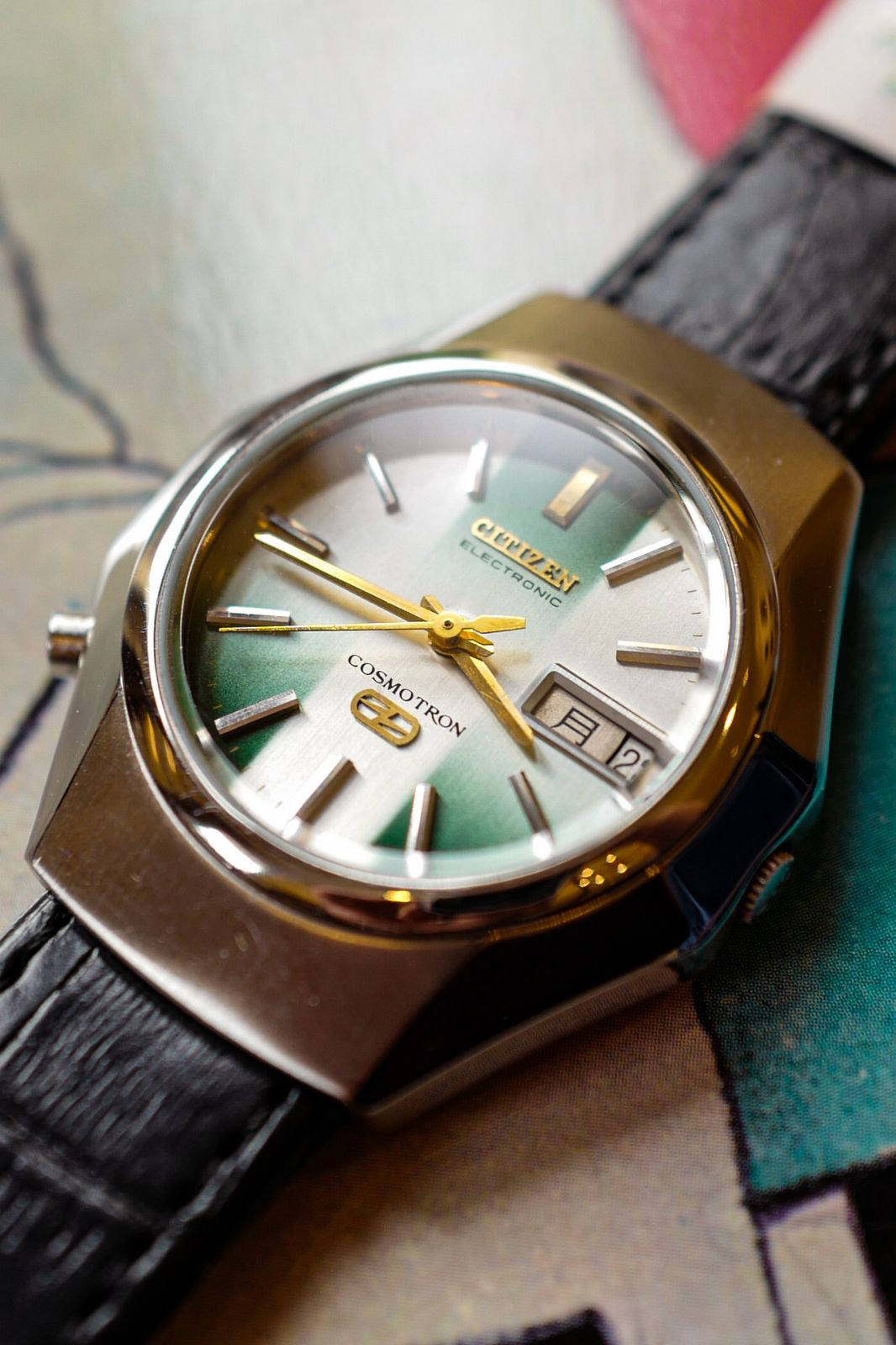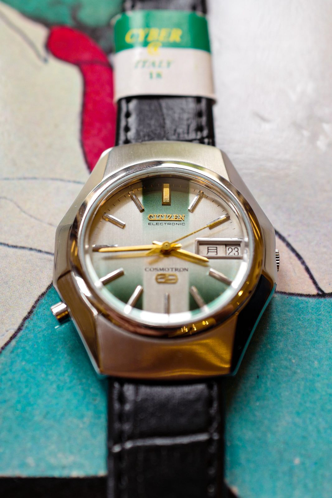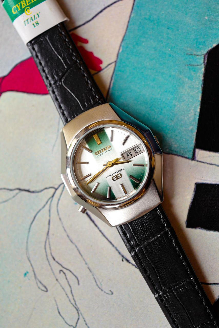 Bringing you this Citizen Cosmotron Electronic from 1974 in nearly “NOS” New Old Stock condition! This Citizen Cosmotron is as cool and and as quirky as it gets. Let’s start with the movement itself, the cal. 7803 in this Cosmotron is basically a hybrid movement, combining mechanical parts and battery power as well. This type of movement is called an electronic movement, which then became replaced with the more accurate quartz movement. This electronic movement in this Cosmotron is just so cool, as the second hand sweeps like a traditional automatic watch, but uses a battery just like a quartz watch. Moving on to the the funky dial and shape of the case, we think that this is what makes the watch so cool and quirky. The gradient green and silver dial makes the overall watch looks more funky than a whole Kool & the Gang album. Combined with the “spaceship” like case design, makes the overall appearance of the watch ultra-galactic!