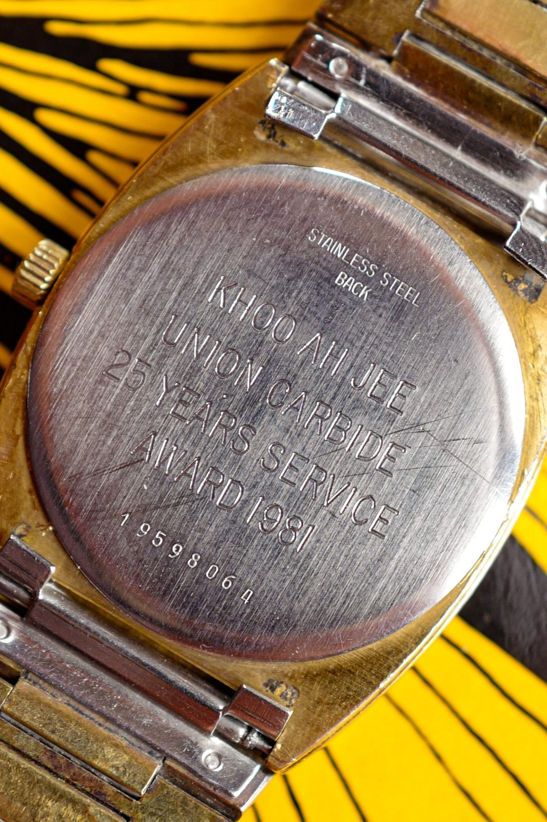 This is a Longines automatic tonneau case with an engraved caseback awarding an individual “Khoo Ah Jee” for his 25 years of loyal service in Union Carbide in 1981. Now, it’s pretty common to see watches gifted to a loyal employee who had worked hard for many decades in a company, but this watch have more story to tell.