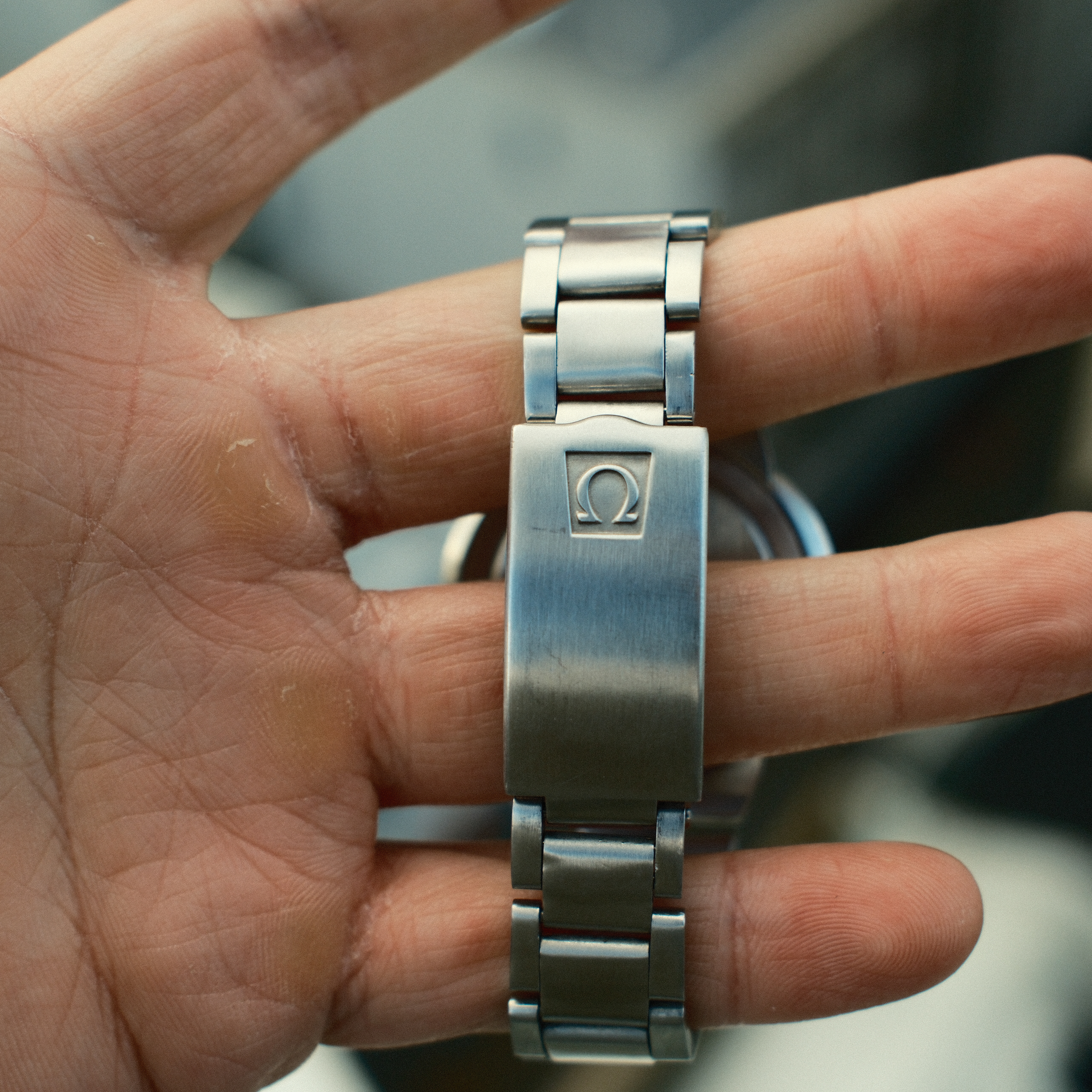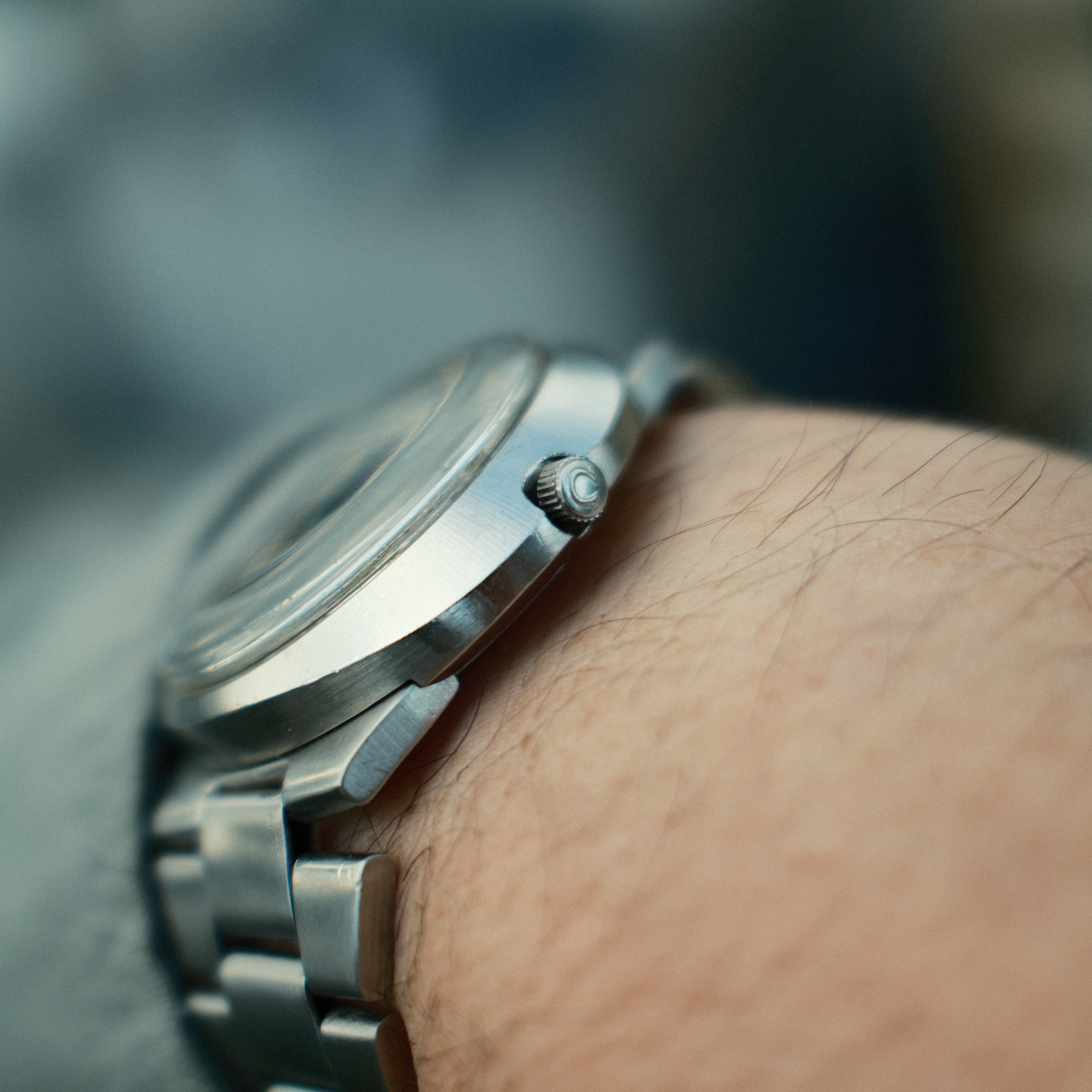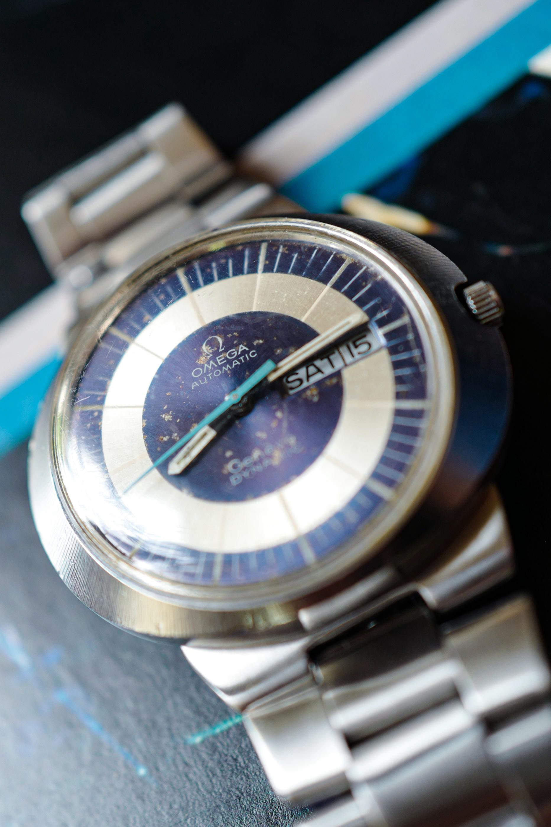 This watch is in exceptional and original condition. The original dial has started to age into a beautiful patina that features overall and consistent spotting on the blue surface that we think quite resembles the cosmos. The lume on the hands and dial are all original and had never been touched up and has aged beautifully into a creamy color. The case is still very sharp and retains all its original shapes and had likely rarely seen a polishing machine. The crown is original Omega stamped, and the watch also still has the original Omega signed crystal. The movement runs great and is keeping excellent time for a vintage watch.