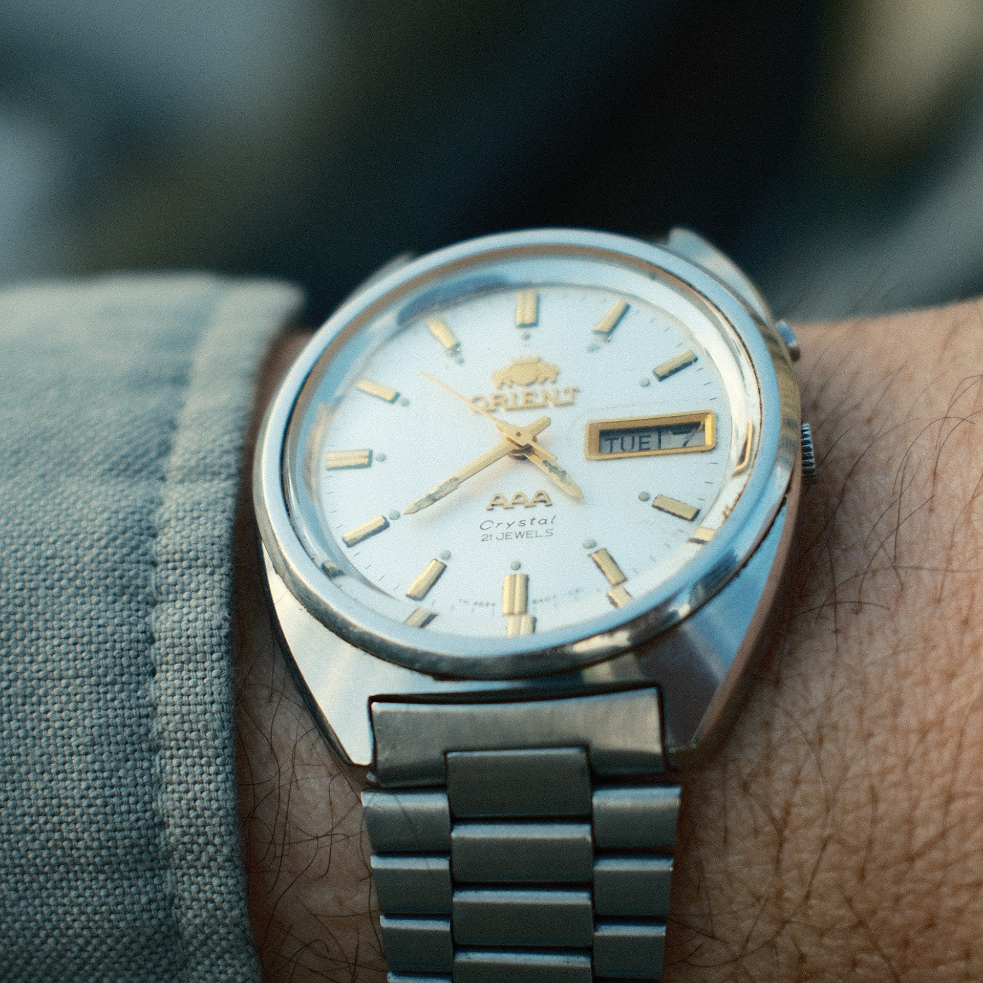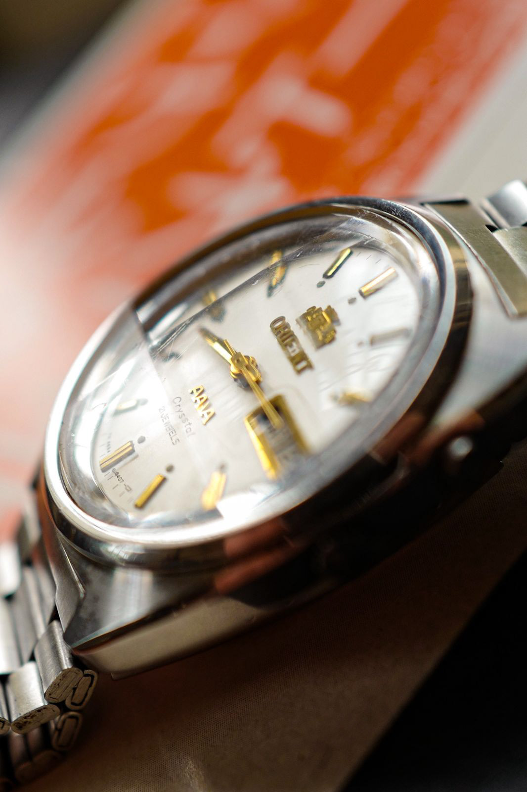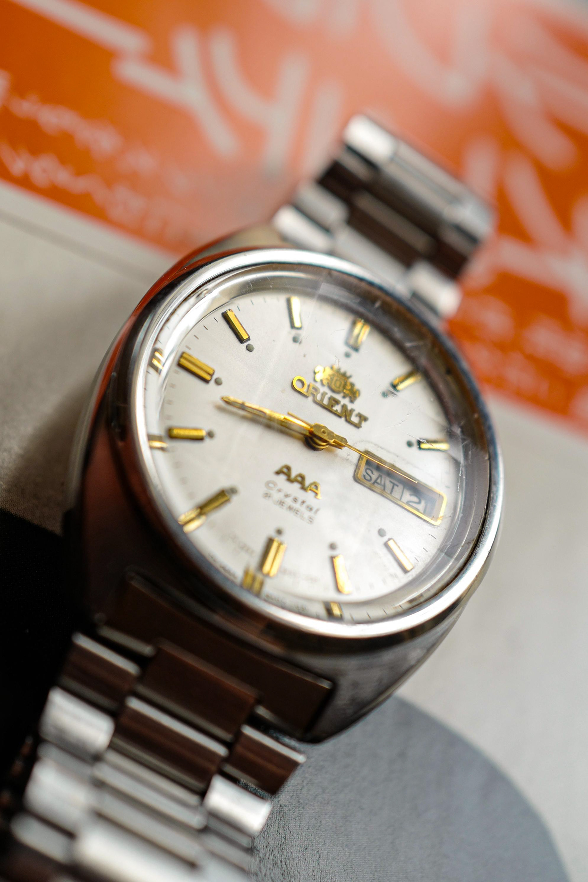 One of our personal favourite watches from our collection, this Orient AAA Automatic represents a higher-end offering from Orient. The watch features higher quality materials and a more intricate design, but primarily what sets aside the AAA line apart is its faceted crystal that forms a ruby square shape on its crystal. This is a design element that became popular back in the 70s and 80s. On first glance, it looks subtle, but the faceted crystal is the highlight of the design element of this watch. Featuring a 21 jewel automatic movement, this movement is known for its durability and accuracy, making this watch setting a standard in its cool design element and robustness for daily use.