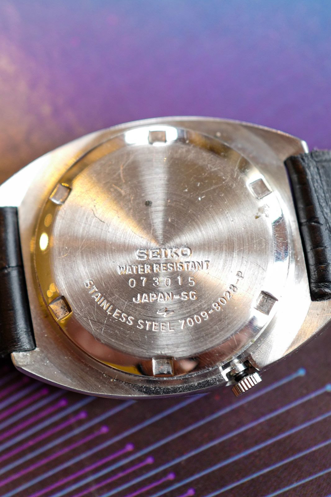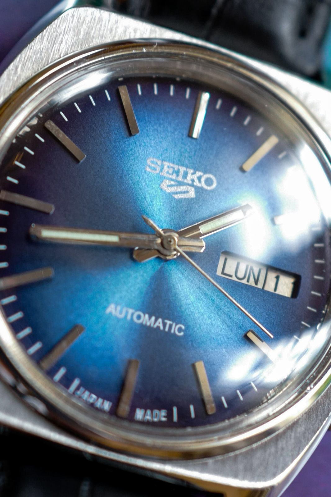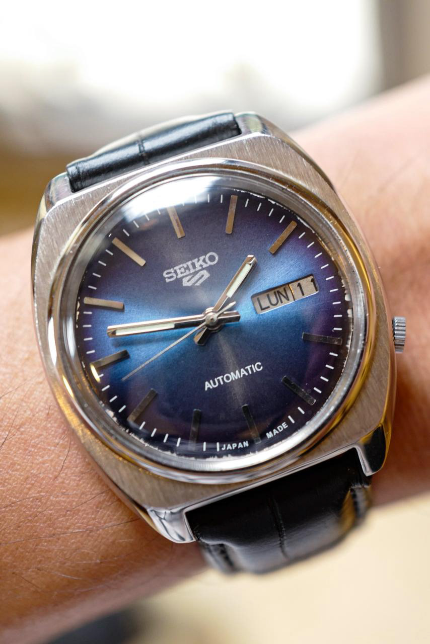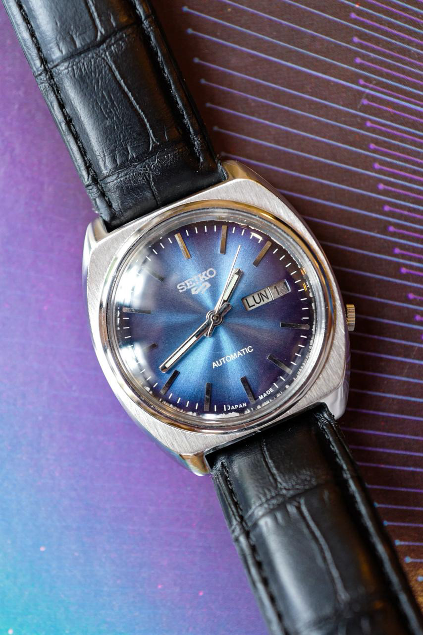 The first thing you notice is the dial, a deep blue sunburst dial that really pops out. This 1980 Seiko 5 7005-8028 would make a really fun and affordable watch in your collection, with its robust movement and stunning blue sunburst dial. The cushion shaped case is robust, ready to be worn daily with its brushed steel on top and polished edges. This Seiko 5 would be a watch you’d be able to wear without any worry, and enjoy it to the fullest.