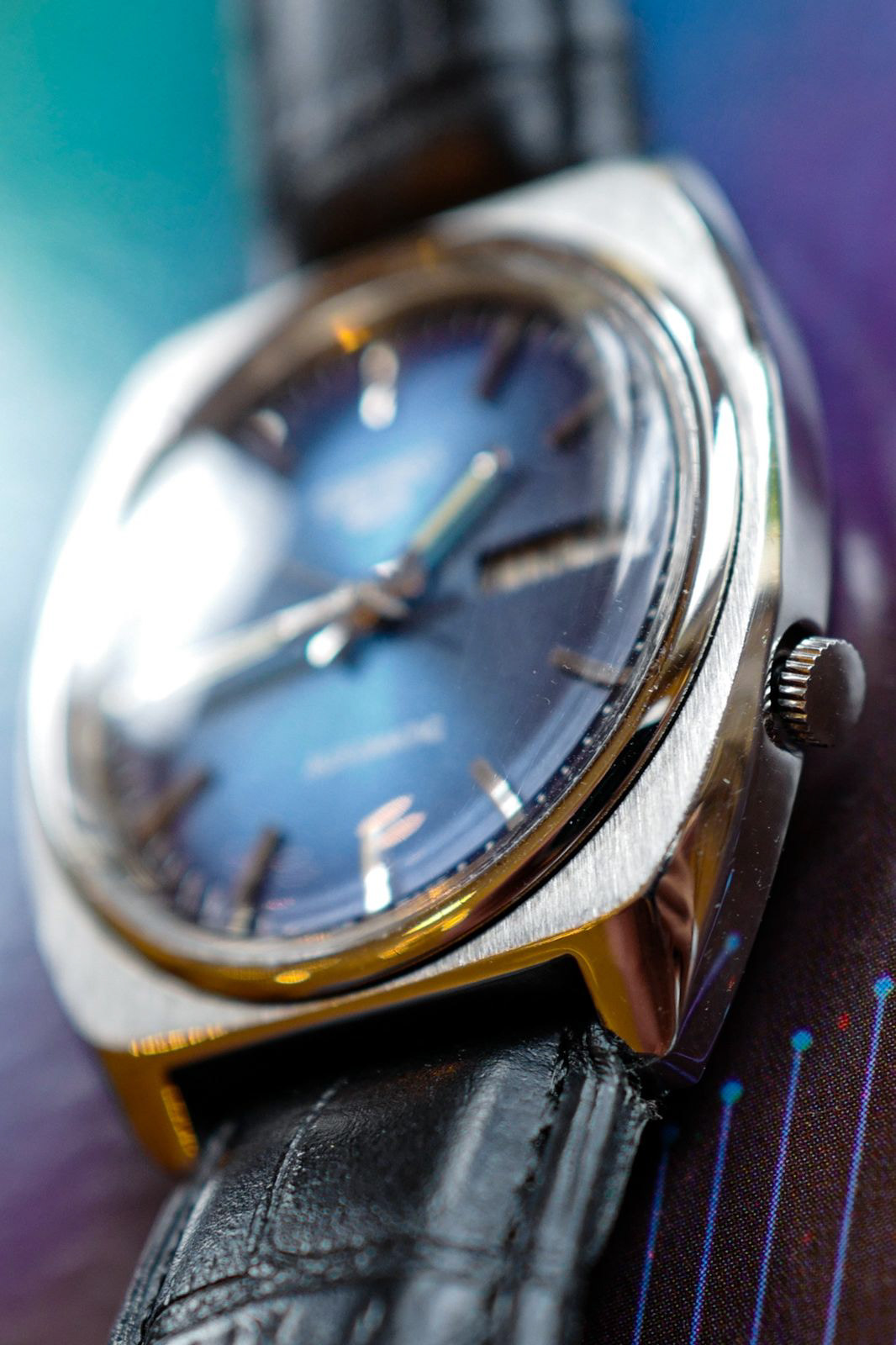 The blue sunburst dial appears to be professionally restored, with the hands relumed, case polished, and crown replaced. The movement has been serviced, dismantled, oiled and is now keeping great time. This watch is perfect for someone who is not looking for an all original example but rather a vintage watch that would be functional for day to day use.