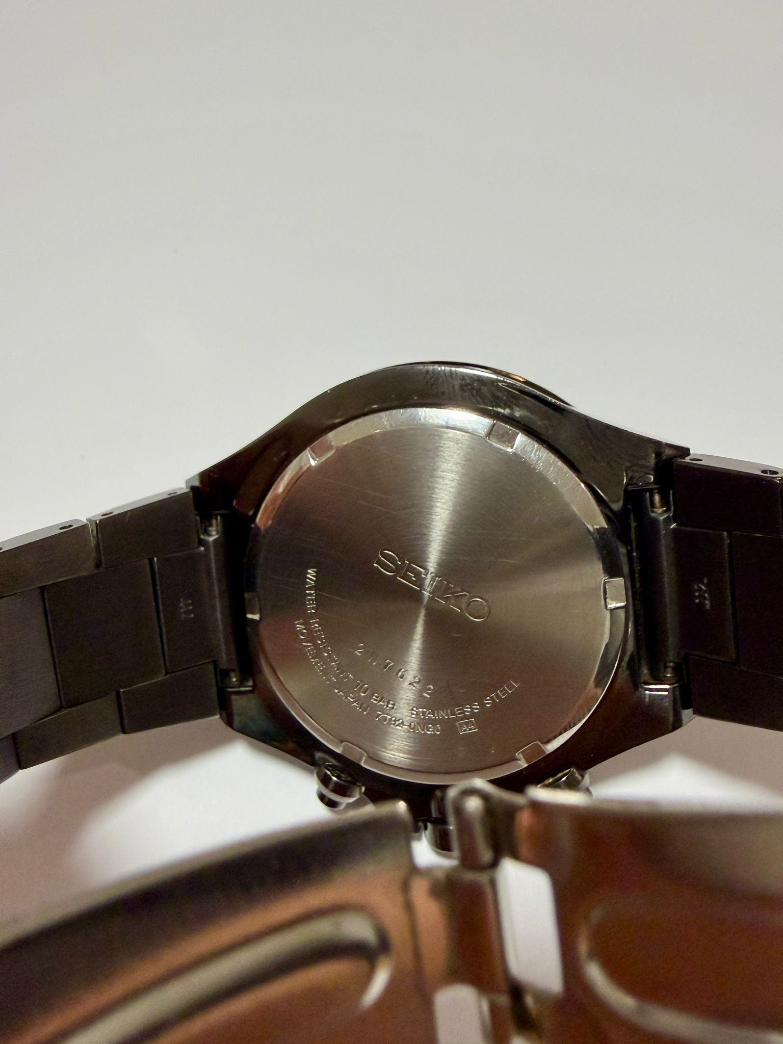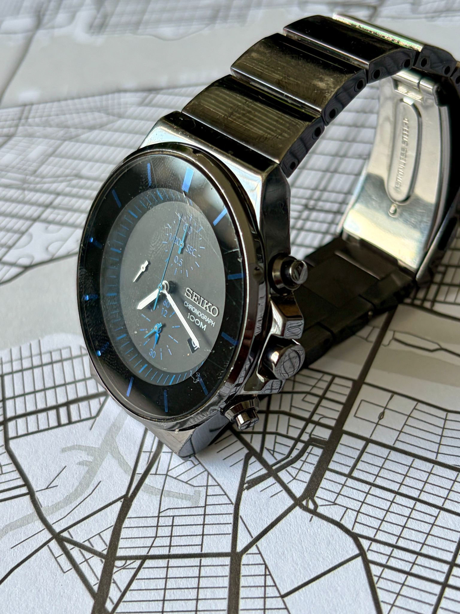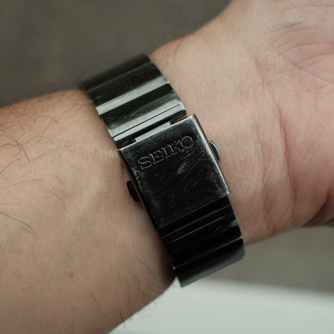 This Seiko is a robust tool watch built for reliability and endurance. With its black ion-plated stainless steel case and bracelet, this timepiece was designed to handle the rigors of daily wear — and it shows. This bracelet displays visible scratches and wear, especially on the top surfaces and some minor scratches on the dial.