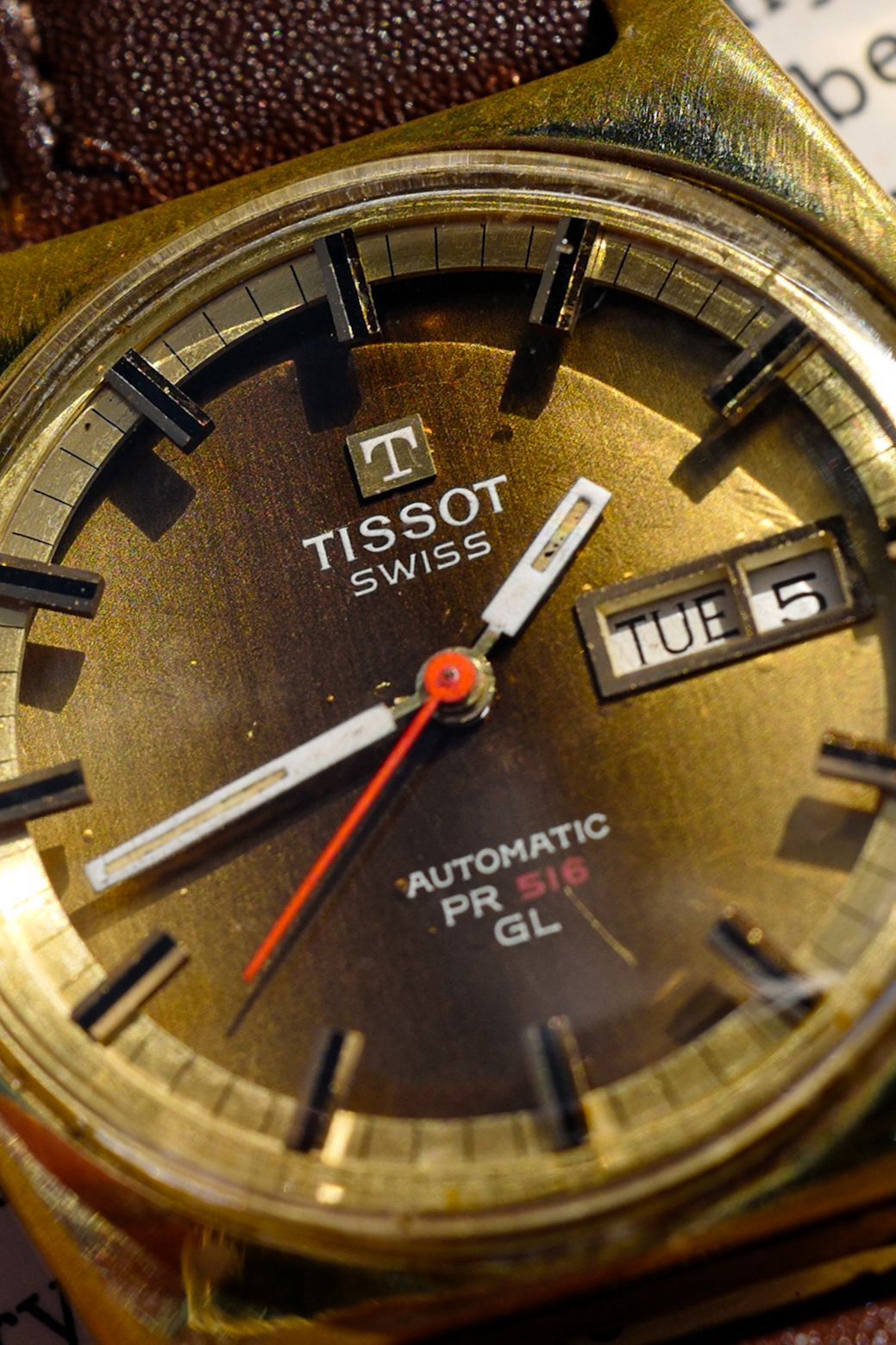 Presenting you this vintage Tissot PR 516 GL from the 1970s! Having a long history in the Swiss watch making industry, known for producing high quality timepieces for the best value for money, their reputation had been earned for over 172 years since they were first found in 1853. The watch we have here is in all discern on the reputation the brand had built for more than a century. The “PR” stands for “Particularly Robust”, and “516” refers to the movement calibre origin, while “GL” denotes the specific design of the PR lineup. Aside from the gradient brown dial, alongside its orange second hand, what makes the dial so cool is that the hour indices are actually floating over the main dial, creating a 3 dimensional affect. This was certainly an innovative design especially back in the 70s where it wasn’t commonly seen. The watch also has a gold-filled case which we think suits the gradient brown dial very well creating an elegant but also sporty look.