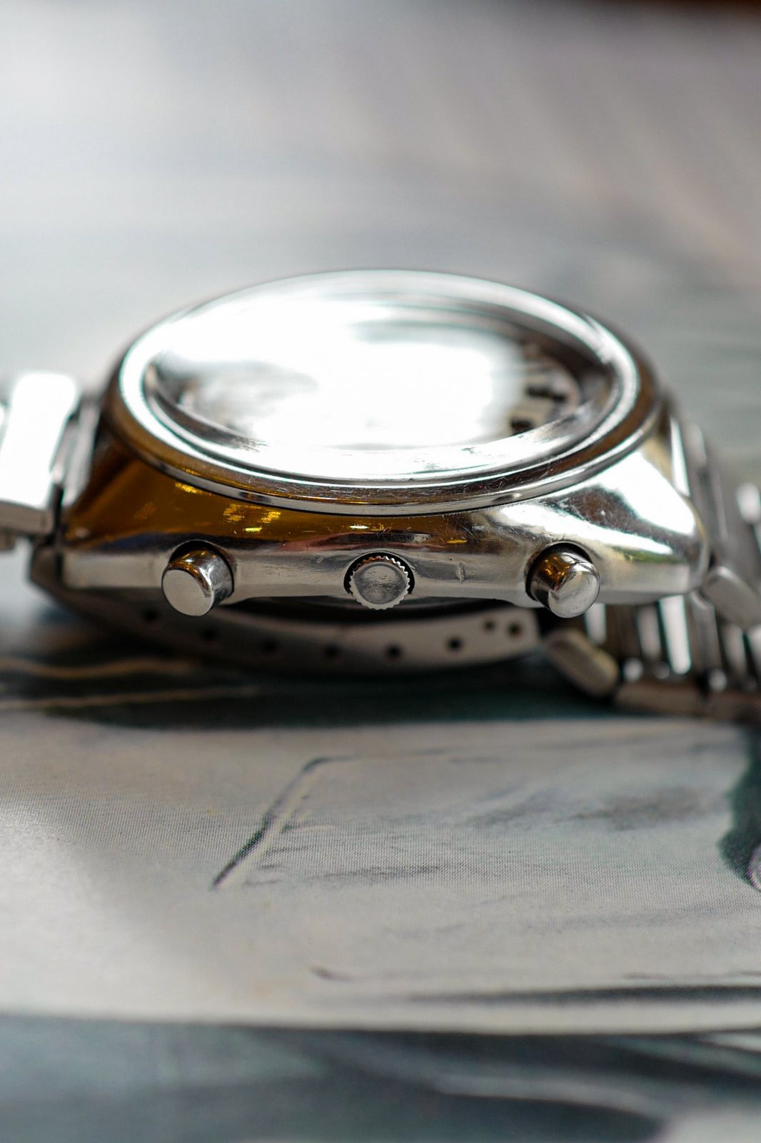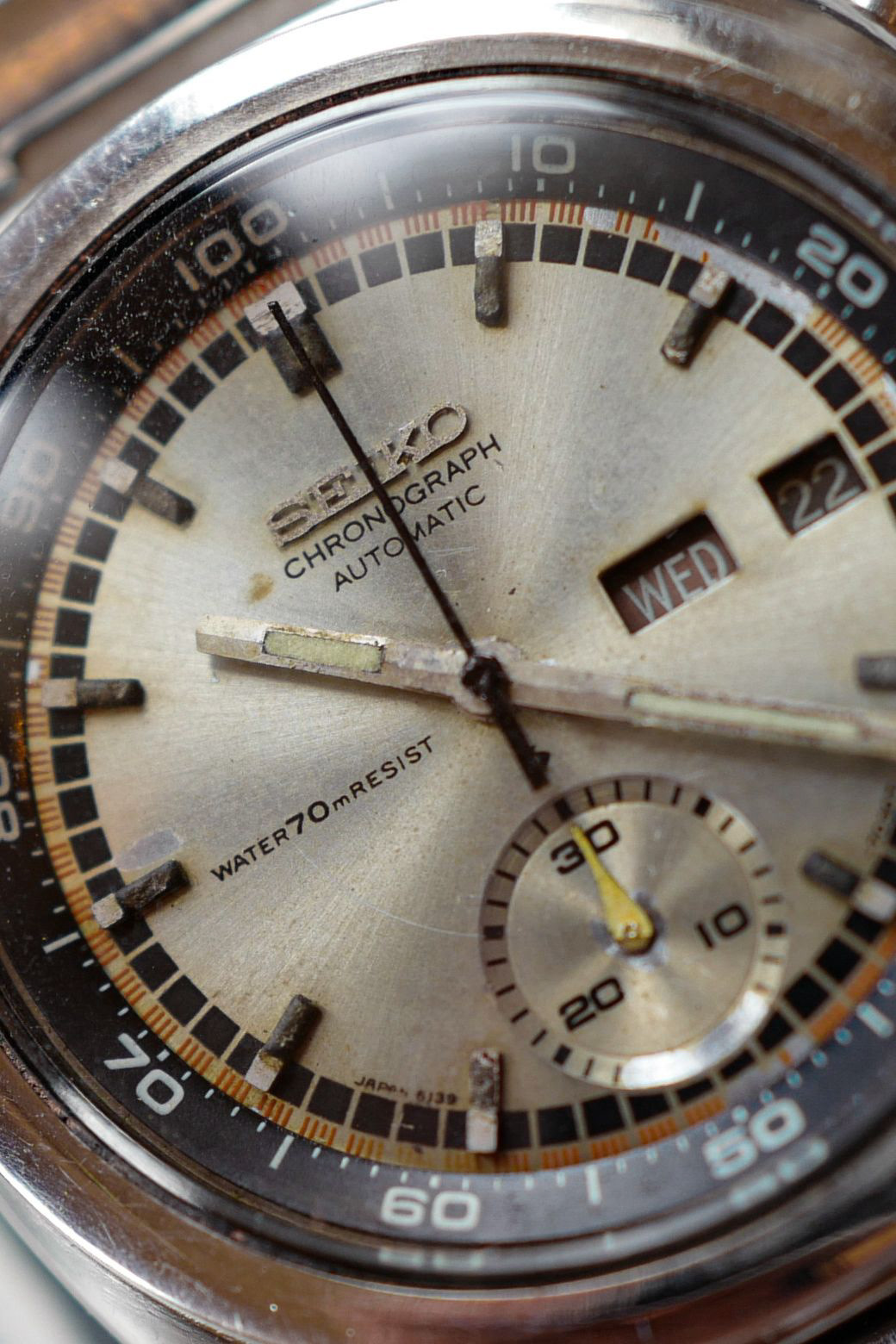 The watch is in overall good and mostly original condition. The original dial had aged beautifully, showing some signs of wear. There are a few marks on the dial, and the red tachymeter track circling the dial has some fade. The hands are original, although the chronograph hand appeared to had been repainted black at some point in its life. The lume had been relumed on the hands. The bracelet is the factory original Seiko bracelet, with the case appearing to had been polished in the past but still retaining its shape nicely. This movement has been serviced, oiled, dismantled and is keeping good time.